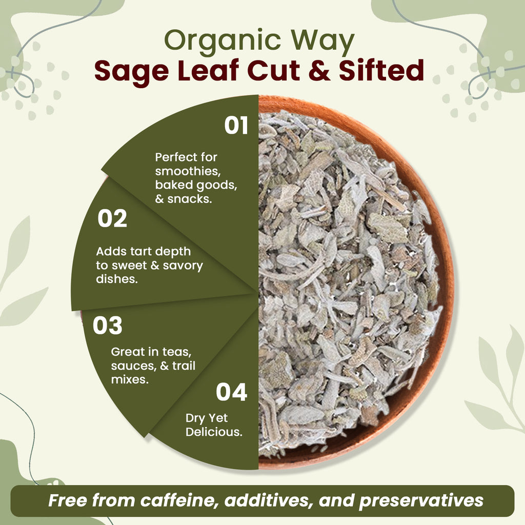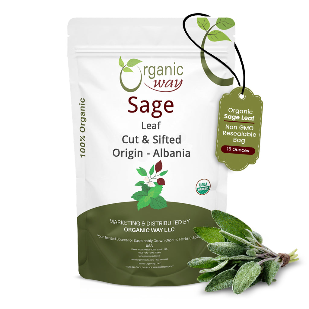 Product Description: Our Sage Leaf is organically grown in Albania and imported to USA after proper examination before import. After microbial and metal testing our products are certified by USDA and Kosher. Organic Way's Sage Leaf, Cut and Sifted is a popular herbal product and serves as a supplement for depression, alzheimer's, diarrhea, heartburn and other conditions.