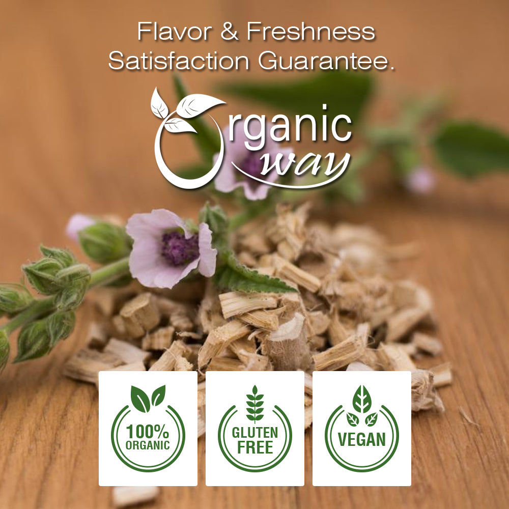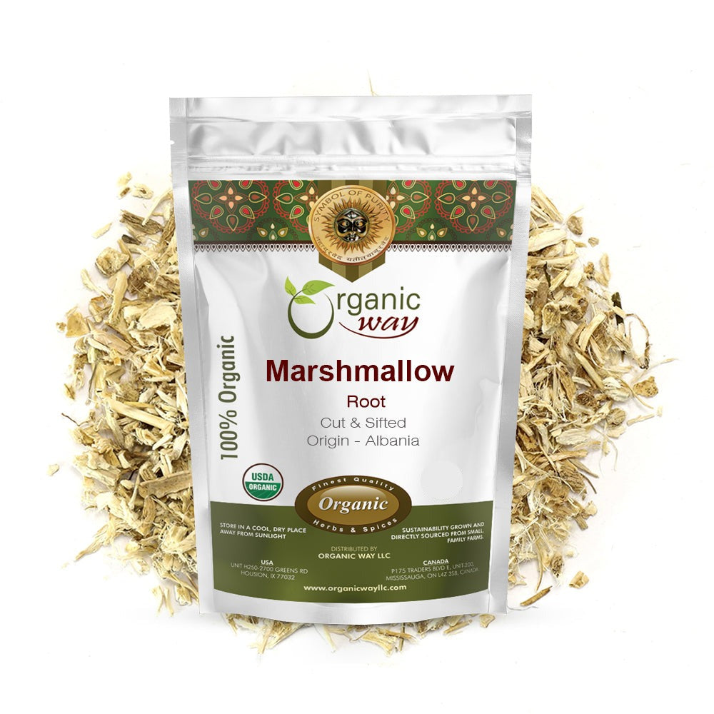 Our Marshmallow Root cut and sifted can be used in foods and it can also be of great help in treating mild coughs and cold. Marshmallow is known to work as an antioxidant when applied on wounds as well. You can rely on our products for authenticity and potency. Organic Way imports quality organically grown products from different countries and processes them in the USA for the US market. Therefore, all our products are USDA and Kosher approved and perfectly safe for use.